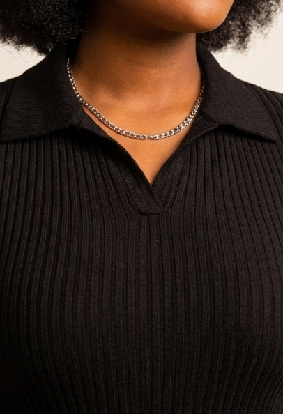 Ma chérie, voici la robe qui met tout le monde d'accord. C’est le genre de vêtement qui montre que tu es une femme sérieuse, organisée et très élégante. Sa couleur noire unie est une valeur sûre : elle affine la silhouette et te donne une allure de "boss". Avec son petit col polo, elle mélange le style chic et le côté relax pour un résultat "propre" que tout le monde va admirer.